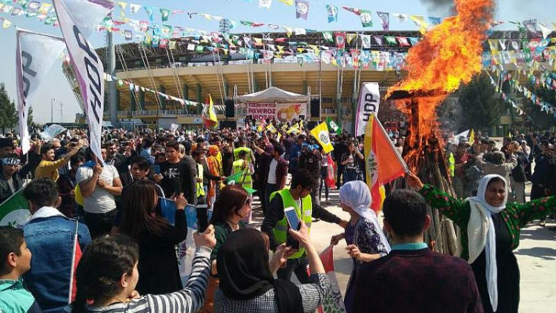 Demokratik Toplum Kongresi (DTK), Halkların Demokratik Kongresi (HDK), PKK'nın kadın yapılanması Tevgera Jinên Azad (TJA), Demokratik Bölgeler Partisi (DBP) ve Yeşil Sol Partisi öncülüğünde Saray Mahallesi’nde bulunan Nevruz Alanı’nda kutlama gerçekleştirildi. Alandaki partilerin bayrakları açılırken sık sık “Bijî Serok Apo” sloganı atıldı.